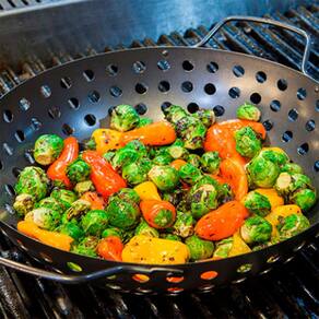 A panela Wok possui cabo removível e aplique em madeira para proteger as mãos do calor da churrasqueira. Facilita virar a carne, grelhando por igual.