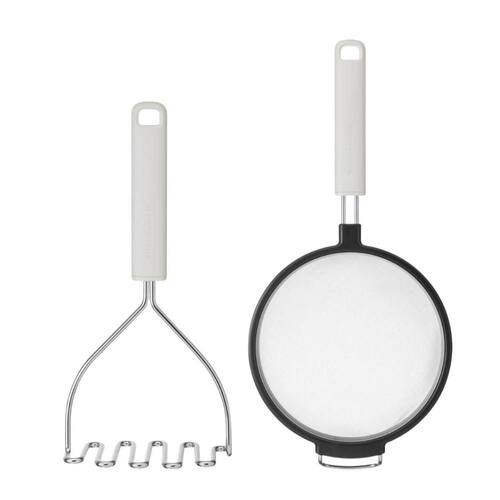 O amassador de batatas garante purês lisos e vegetais amassados com facilidade, com cabeça robusta em aço inox resistente à ferrugem.