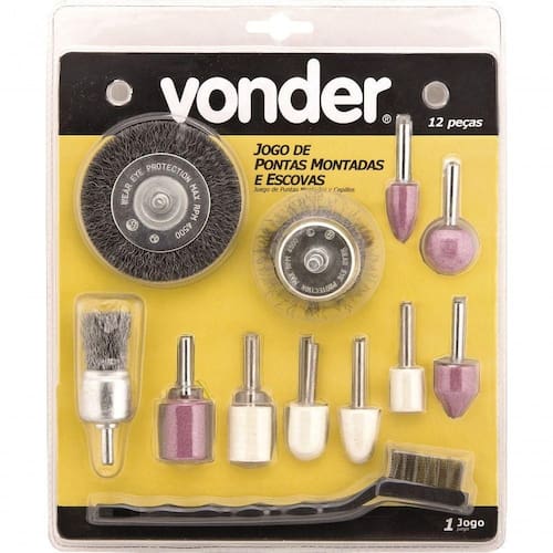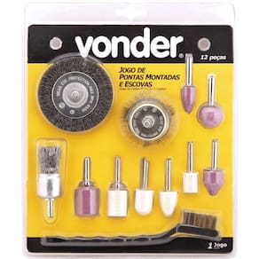 Jogo Ponta Montada E Escovas Com 12 Peças Vonder Conteúdo da embalagem Jogo com 12 peças sendo: 1 miniescova manual com cabo plástico, 1 escova tipo pincel 1 haste 6 mm, 1 escova tipo copo 2 haste 6 mm, 1 escova circular 3 x 3/8 haste 6 mm, 4 pontas montadas haste 6 mm e 4 pontas montadas com feltro haste 6 mm Aplicações e dicas de uso Indicado para retificar, desbastar e limpar pequenas peças. Utilizado em furadeiras. Destaques e diferenciais Facilita o trabalho em locais de difícil acesso DETALHES TÉCNICOS