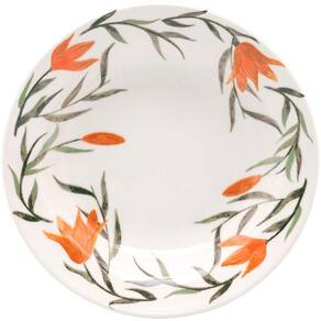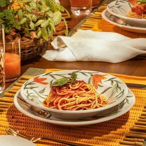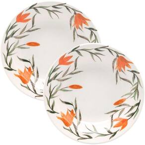 Os lírios são uma das flores mais comuns em jardins e casas brasileiras. Na ;coleção Donna Biona Lírios, ele vira a estrela principal da decoração. As bordas de ;cada borda e pires recebem o desenho feito à mão da flor de cor laranja junto de ;ramos e folhas. As cores são vibrantes e trazem alegria à mesa