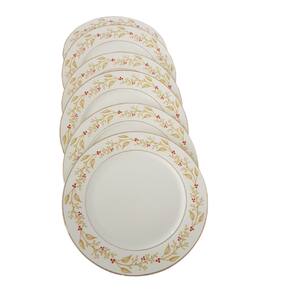 JOGO DE PRATOS RASOS COM 6 PEÇAS, CONFECCIONADOS EM PORCELANA BRANCA COM RAMOS E FIO DOURADO NA BORDA.