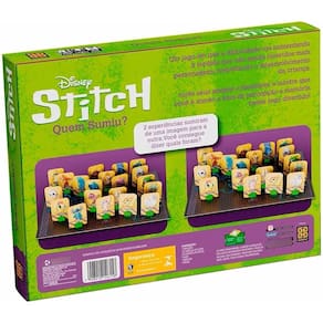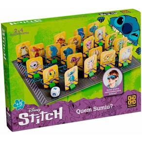 Jogo Infantil - Disney Stitch - Quem Sumiu? - Grow: um jogo em que a dificuldade vai aumentando à medida que vão sendo inseridos mais personagens, respeitando o desenvolvimento da criança. Junte seus amigos e familiares e mostre que você é atento e bom de percepção e memória nesse jogo divertido! 2 experiências sumiram de uma imagem para a outra. Você consegue dizer quais foram?Como jogar Quem Sumiu Stitch?01) Para jogar, o líder lança o dado e, se o resultado for 0, passa a vez para o jogador à esquerda. Se o resultado for maior que 0, o líder coloca uma venda no jogador à esquerda, pede para ele virar de costas e retira do tabuleiro a quantidade de aliens indicada no dado02) Em seguida, o líder esconde os aliens na caixa do jogo e dá o sinal para o jogador da vez03) O jogador da vez deve retirar a venda, virar-se e identificar os aliens que sumiram04) O jogador que acertar recebe os aliens que identificou e os mantém para si05) Os aliens que não forem identificados voltam para o tabuleiro e uma nova rodada começa06) O jogador que tiver mais aliens no final da partida venceObjetivo do Jogo:• Adivinhar qual é o personagem do seu oponente primeiroInformações:• Produto: Jogo Quem Sumiu? Stitch• Marca: Grow• Coleção: Disney-Stitch• Categoria: Jogos e Tabuleiros• Tipo de jogo: Jogo de Memória e Percepção• Objetivo: Identificar quais experiências sumiram de uma imagem para outra• Tempo médio de jogo: 15 minutos• Jogadores: para 02 a 04 participantes• Conteúdo:- 01 Tabuleiro- 20 cartelas de aliens- 20 suportes plásticos- 01 dado- 01 máscara- 01 manual de regras• Recomendação: para crianças a partir de 06 anos de idadeEspecificações:• Referência: 04615• Código de Barras: 7908010146158• Embalagem (C x A x L): 31.4 x 23.5 x 4.5 cm• Embalagem (Peso): 0.355 kg• Composição / Material: Papel, Papel Cartão e Plástico