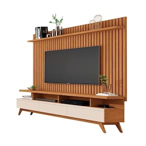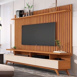 O painel conta com uma prateleira para acomodar os objetos decorativos, plantas, livros , videogames e aparelhos de . possui um design elegante com os seus detalhes ripados em alto relevo