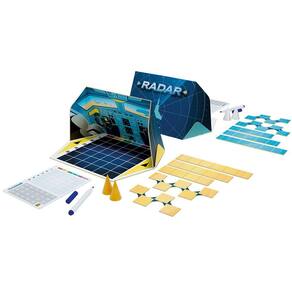 R: A caixa do Jogo Radar inclui 2 centros de comando, 2 tabuleiros de controle, 10 frotas, 4 pinos (mísseis), 2 canetas, 2 paninhos para limpeza e 1 regra.