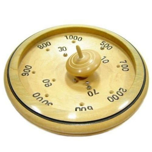 Após colocar as esferas de metal no centro da base de madeira, o pião é girado e consequentemente as esferas são deslocadas para as extremidades da base, sendo assim cada esfera cai dentro de um buraco, no qual cada um possue sua pontuação.