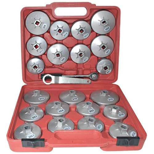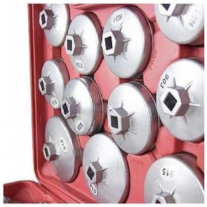 DM-410 Jogo de saca filtro de oleo com 23 peças. Jogo de saca filtro de óleo com chaves catraca e estrela, para aplicação dos copos nos filtros de óleo inclusas; Diferente de alguns kits do mercado, este kit atende uma grande variedade de veículos nacionais e importados Linha leve e Utilitários, por apresentar copos de diversos tamanhos; Aplicação: Mazda,Toyota, GM, Lexus, Isuzu, Mercedes, Volvo, Porsche, Renault, Ford, Honda, Audi, VW, FIAT. Fabricado em Alumínio; Desenvolvido especialmente para troca de filtro de óleo; Composição: 23 peças, sendo: 65mm/14 dentes, 67mm/14 dentes, 74mm/14 dentes, 75mm/15 dentes, 74mm/15 dentes, 74mm/8 dentes, 73mm/14 dentes, 75mm/18 dentes, 74mm/15 dentes, 79mm/15 dentes, 72mm/15 dentes, 74mm/14 dentes, 84mm/18 dentes, 89mm/15 dentes, 91mm/15 dentes, 92mm/15 dentes, 95mm/15 dentes, 76mm/12 dentes, 79mm/15 dentes, 101mm/15 dentes, 92mm/15 dentes, Chave catraca e Chave estrela. Marca: DM Ferramentas : 6 Meses