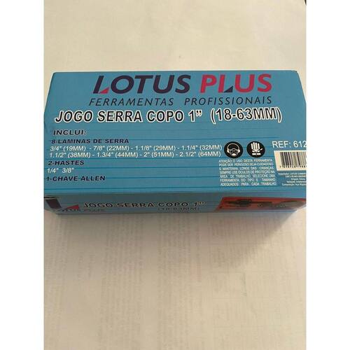 Jogo Serra Copo 1 18 63mm Lotus Conjunto de serras copo para madeira ideal para confecção e Manutenção de móveis, fazer furos para passar cabos e outras Aplicações. De 1 18-63mm .O kit de serra copo contém:8 Serra copos: 19mm , 22mm , 29mm , 32mm , 38mm , 44mm , 51mm , 64mm 1 Chave Allen2 Hastes 1/4", 3/81 Broca Chata 20"