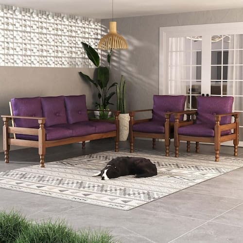 Acabamento: Pintura PU | Cor: Lilás | Tonalidade: Lilás | Material: Madeira | Referência do Modelo: CR7001 | Coleção: Liz | Instruções de Cuidado: Utilize aspirador de pó levemente. Não utilizar produtos químicos ou abrasivos. | Sistema de Montagem: O produto acompanha manual de montagem juntamente com kit ferragem. O produto será entregue desmontado e não disponibilizamos o de montagem. | Conteúdo da Embalagem: 1 sofá 3 lugares com almofadas, 2 poltronas com almofadas, manual de montagem e kit ferragem. | Altura Montado: 90 | Largura Montado: 165 | Profundidade Montado: 73 | Tamanho (L x A x P): 165 x 90 x 73 | Peso do Produto: 53 | Fabricante: Belini | Garantia do Fabricante: 3 | Requer Montagem: Sim | Altura (cm): 90 cm | Largura (cm): 165 cm | Profundidade (cm): 73 cm | Peso máximo suportado: 260 kg | Produto: Sofá | Quantidade de Lugares: 5 | Tipo de produto: Sofá | Material do estofado: N/A | É reclinável: Não | Orientação do sofá: N/A | Material dos pés: Madeira | Cor dos pés: N/A | Formato do sofá: N/A | Estilo: Retrô/Vintage | Materiais da Estrutura: Pinus | É sofá-cama: Não | Tipo do Sofá: Simples | Material de enchimento do encosto: N/A | Unidades por kit: 3 | Densidade da espuma do assento: N/A | Altura da cama: N/A | Largura do colchão: 0 cm | Largura da cama: N/A | Profundidade da cama: N/A | Comprimento do colchão: 0 cm | Mecanismo de abertura do produto: N/A | Acessórios incluídos: N/A | Marca: Multimóveis | Destaque 1: Estrutura em madeira maciça de pinus. | Destaque 2: O sofá suporta até 260kg e cada poltrona suporta até 100kg. | Destaque 3: Acomoda até 5 lugares. | Destaque 4: Fácil montagem e instalação. | Destaque 5: Tamanho do produto montado (L x A x P): 165 x 90 x 73 cm | Quantidade de caixas de embalagem: 06 | Quantidade de peças: 3 | É canto: Não | Inclui colchão: Não | É chaise: Não | Com tecido removível: Não | É Modular: Não | Com pés desmontáveis: Não | É Em forma de U: Não | Baterias são necessárias?: Não | Certificação de teste externa: N/A | Is Fragile: Não | Dimensões do item P x L x A: depth#value=73;depth#unit=centimeters;width#value=165;width#unit=centimeters;height#value=90;height#unit=centimeters | Quantidade de itens: 1 | Peso do item: unit=kilograms;value=53 | da peça: CR7001.UL4 | Tipo de Garantia: Garantia do Fabricante | Montagem: Necessita Montagem | Inclui manual de montagem: Sim | País de Origem: | Peso (kg): 53 kg | É sofá na caixa: Não | Componentes incluídos: Ferragens