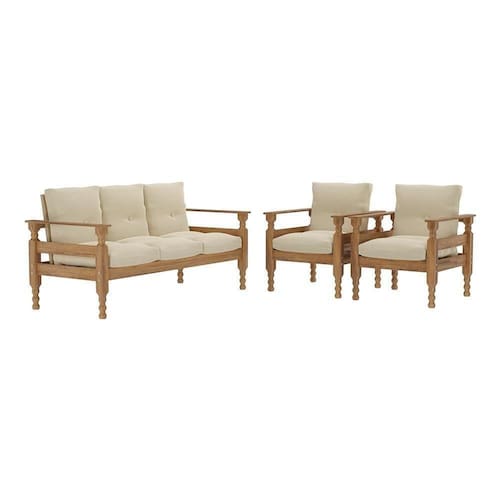 Acabamento: Pintura PU | Cor: Bege | Tonalidade: Bege | Material: Madeira | Referência do Modelo: VCR7001 | Coleção: Liz | Instruções de Cuidado: Utilize aspirador de pó levemente. Não utilizar produtos químicos ou abrasivos. | Sistema de Montagem: O produto acompanha manual de montagem juntamente com kit ferragem. O produto será entregue desmontado e não disponibilizamos o serviço de montagem. | Conteúdo da Embalagem: 1 sofá 3 lugares com almofadas, 2 poltronas com almofadas, manual de montagem e kit ferragem. | Altura Montado: 90 | Largura Montado: 165 | Profundidade Montado: 73 | Tamanho (L x A x P): 165 x 90 x 73 | Peso do Produto: 53 | Fabricante: Belini | Garantia do Fabricante: 3 | Requer Montagem: Sim | Altura (cm): 90 cm | Largura (cm): 165 cm | Profundidade (cm): 73 cm | Peso máximo suportado: 260 kg | Produto: Sofá | Quantidade de Lugares: