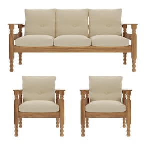 O Jogo Sofá Madeira Maciça 3 lugares e 2 Poltronas Liz Multimóveis é produzido em madeira maciça de pinus proveniente de reflorestamento e possui almofadas soltas preenchidas com flocos de espuma e revestidas em poliéster, que garante maior conforto e durabilidade. Uma ótima opção para deixar sua sala de estar acolhedora para curtir os melhores momentos com a família ou amigos.