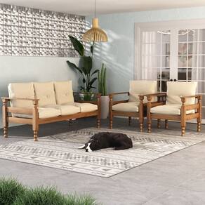 O Jogo Sofá Madeira Maciça 3 lugares e 2 Poltronas Liz Multimóveis é produzido em madeira maciça de pinus proveniente de reflorestamento e possui almofadas soltas preenchidas com flocos de espuma e revestidas em poliéster, que garante maior conforto e durabilidade. Uma ótima opção para deixar sua sala de estar acolhedora para curtir os melhores momentos com a família ou amigos. O sofá suporta até 260kg e cada poltrona suporta até 100kg.