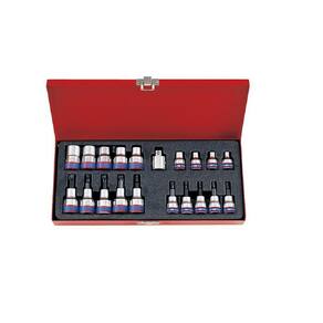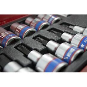 Composto por 20 peças, sendo: 01 adaptador de 1/2 x 3/8 05 soquetes com ponta tork com encaixe de 3/8: t10 - t15 - t20 - t25 - t27 05 soquetes com ponta tork com encaixe de 1/2: t30 - t40 - t45 - t50 - t55 04 soquetes tork com encaixe de 3/8: e6 - e7 - e8 - e10 05 soquetes tork com encaixe de 1/2: e12 - e14 - e16 - e18 - e20