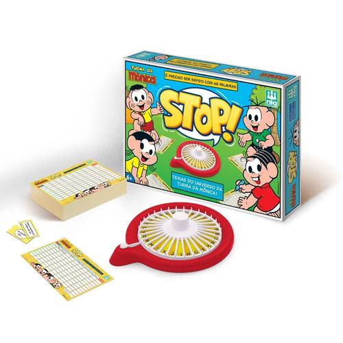 Jogo Stop Turma da Mônica da Nig Brinquedos. Ficou Mais Divertido Jogar Stop com Os Temas do Universo da Turma da Mônica! A Criança Gira a Roleta, Tira Uma Letra e Preenche Sua Cartela com Temas Que Serão Sorteados Dentro do Saquinho. o Que a Magali Gosta de Comer, do Que a Turminha Brinca, Responda Rápido e Diga Stop! Acompanha Blocos Para Preencher com Palavras e Anotações Dos Pontos. Ean: 7896200707596