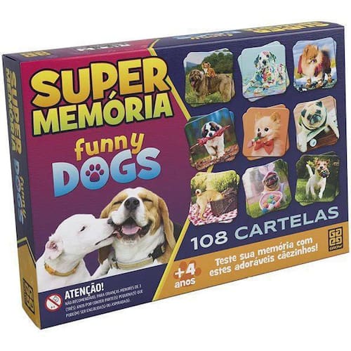 O Super Memória Funny Dogs traz 108 cartelas com imagens de cachorros fazendo arte. As crianças irão se divertir muito e será possível desenvolver as habilidades de percepção e memória, de uma forma leve e gradativa. Quantidade de peças: 108 Idade: a partir de 4 anos Conteúdo da Embalagem:1 jogo com108 cartelas Produto Certificado:CE-BRI/ICEPEX-N 01264-25 - NM300-2004 OCP 0046 Informações Adicionais:Não recomendável para menores de 3 anos por conter partes pequenas Dimensões embalagem24 x 4 x 18 cm Peso: 200 g Referência: 03935 Material: papel cartão. Garantia: 03 meses defeito fabricação. Ean: 7908010139358
