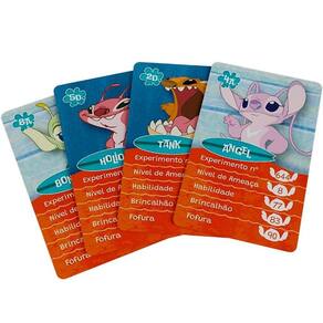 São 32 cartas com ilustrações e informações da turma do Stitch. Em qual item o personagem da sua carta é melhor? Será na habilidade? Na fofura? Ou você tem o Super Trunfo?