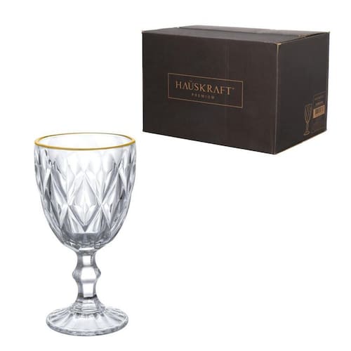 Jogo taça transparente borda dourada 320ml 6 peças Jogo de 06 taças transparente borda dourada 320ml Jogo de 06 taças de vidro transparente borda dourada diamond 320ml de alta qualidade para acrescentar elegância e beleza na sua mesa. Perfeito para ocasiões formais ou mesmo para celebrar um momento especial com familiares ou amigos As taças são espelhada, e possuem 320ml de capacidade, são ideais para água, suco e refrigerante durante um jantar. O conjunto possui design moderno e sofisticado, para você servir deliciosas bebidas com requinte e bom gosto. As taças podem ser utilizadas na decoração de sua mesa posta, cristaleira, ou somente para dar um toque especial em sua cozinha ou sala de jantar. Design: diamond Material: vidro Resistente Durável Capacidade: 320ml Conteúdo: 06 taças transparente borda dourada diamante