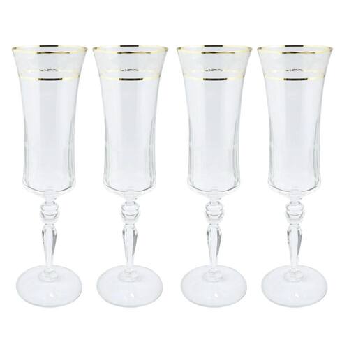 Kit 4 Taças de Champanhe Grace 190ml - Cristal com Friso Dourado Destaques do produto: Design elegante com friso dourado Cristal de alta transparência e brilho Capacidade ideal: 190ml Perfeito para celebrações, eventos e jantares refinados Conjunto com 4 unidades Especificações: Linha: Grace Material: Cristal Capacidade: 190ml por taça Quantidade: 4 taças Marca: Não Informado Ean: 7898762848847