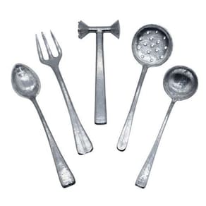 Jogo Talher Alumínio Concha Escumadeira Martelo Garfo Colher Trazemos para você este kit com 5 utensílios completo para sua cozinha. Você terá concha, garfo para churrasco, colher, martelo de bater bife e escumadeira em um único kit. Com design rústico, é produzido em alumínio fundido, não enferruja. Não transmite odor aos alimentos, é ideal para cozinhas tanto domésticas como profissionais. Dimensões: Garfo: 27cm Colher: 29cm Concha: 27cm Martelo: 20cm Escumadeira: 22cm Marca: Shopdapesca Ean: 7895441761817