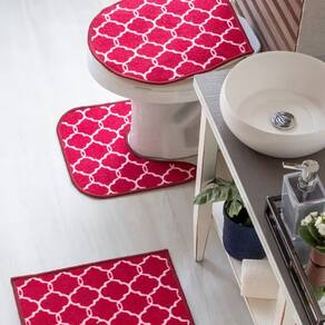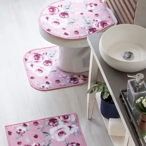 Jogo de tapete para banheiro 3 peças, super prático, antiderrapante e com cores e estampas alegres. O jogo de tapete Carícia possui vários padrões de estampa e cores, é super fácil de lavar, é produzido com propriedades antibactérias e antimofo, além da base antiderrapante.