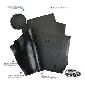 Especificação técnica: - fabricado de borracha injetado flexível - espessura de 3mm a 4mm e bordas de ate 5mm - textura antiderrapante - bordas retentoras de sujeira e mais grossa - material super resistente , não rasga e de grande durabilidade. - personalizado com o nome do carro - baixo odor - cor preta - jogo de 3 peças, sendo 2 peças dianteira e 1 uma única peça traseira - acompanha furação para travar o tapete dianteiros esquerdo motorista
