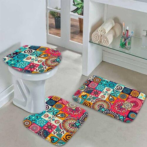 Tapetes para banheiro com base emborrachada antiderrapante. estampa digital de alta qualidade e bordas com costura reforçada.