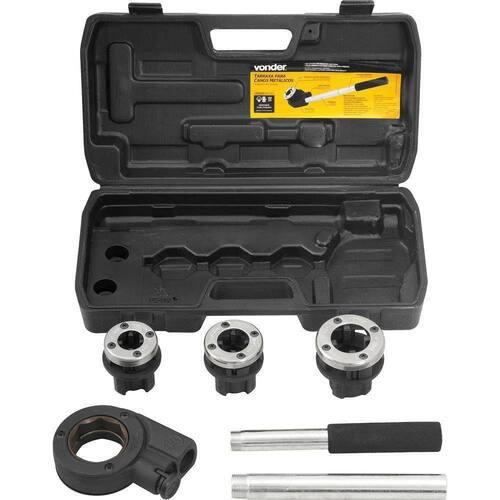 Possui tarraxas reforçadas com base em ferro fundido, cossinetes intercambiáveis em aço temperado proporcionando maior resistência e durabilidade. Conta com porta-tarraxas em ferro fundido com sistema de catraca e botão de reversão permitindo selecionar o sentido de trabalho e guia de posicionamento do cano conferindo maior precisão. Possui ainda cabo bipartido, com encaixes roscados, em estrutura metálica tubular com empunhadura emborrachada que proporciona maior conforto no manuseio.