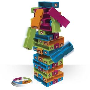 Brinque com Maria Clara e JP construindo a torre, na roleta, sorteie a cordo bloco, tire com cuidado e coloque-o no topo da torre, mas tenha muito cuidado para não fazer um terremoto e perder o jogo.