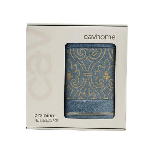 Jogo toalha banhão e rosto 2 peças taj blue ice cavhome Taj A toalha taj faz referência ao taj mahal, uma das sete maravilhas do mundo moderno situado na índia, um monumento conhecido pela sua nobreza. Essa toalha possui super maciez e excelente absorção, com detalhes em seu barrado carrega consigo desenhos majestosos para que seu ambiente fique ainda mais elegante. Ela é produzida com fio 100% algodão convencional de dupla torção, proporcionando melhor absorvência e suavidade. Seu corpo e barrado possuem lindos desenhos arabescos em fio metalizado dourado. Devido seu acabamento sofisticado em jacquard, é considerado um tecido nobre em razão de sua complexidade na produção. As toalhas da cavhome são conhecidas por serem intensamente perfumadas e macias, elas possuem um acabamento de amaciante hidrófilo que além de proporcionar melhor absorção, garantem o conforto necessário após um banho relaxante, será como um abraço