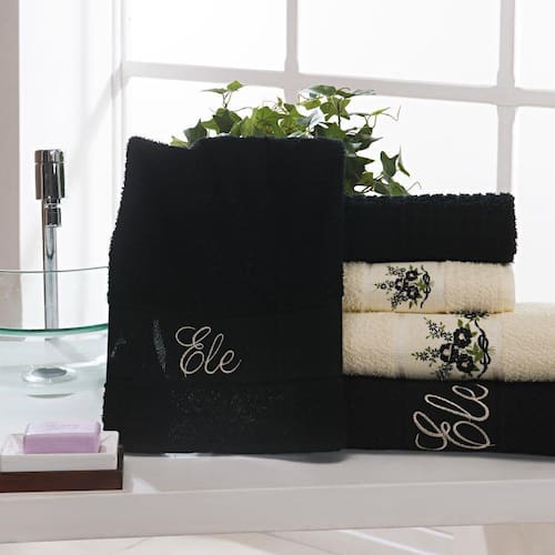 Jogo de toalha de banho bordada 5 peças algodão 290g/m2 elegance Cor: preto/creme Jogo 5 pc bordado ele / ela elegance Jogo de toalha 100% algodão 290g/m2 elegance 05 peças bordadas Descrição do produtoKit contendo:2 toalha de banho 70x1301 bordado ele e outra bordado flor2 toalhas de rosto 70x451 bordado ele e outra bordado flor1 piso - medida 45x68
