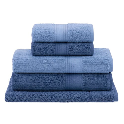 jogo de toalhas de banho buddemeyer 5 peças fio penteado canelado azul/azul classic 100% algodão fibra longa, composto por: toalha de banho, toalha de rosto e toalha de piso. Toalhas pré-lavadas, pré encolhidas, alta absorção e felpa volumosa. A linha possui variedade de cores e tons, que leva para seu ambiente um tom moderno e alegre. Cores em degradê, forma um jogo para ele e para ela, cada um com sua toalha, assim fica fácil de não confundir. Garantia de absorção e durabilidade e um toque suave.