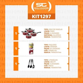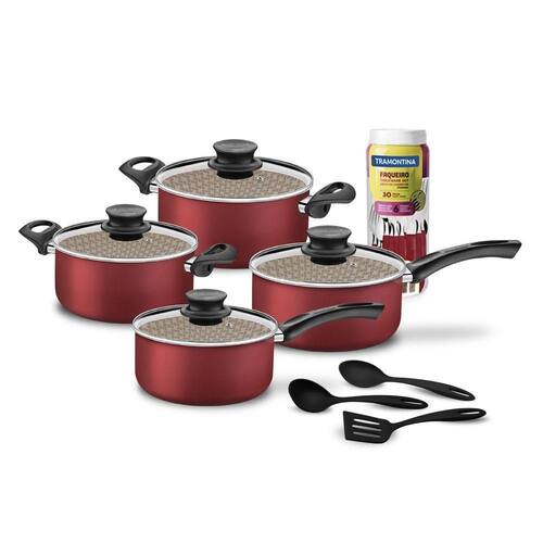 Muito importante: -- conferir produtos no ato do recebimento. Não aceitar produtos com embalagem violada amassado, rasgado, aberto, quebrado, etc , a recusa deve ser feita no ato. Componentes do kit: - 1 caçarola 18 cm 2,1 l paris - 1 caçarola 20 cm 2,9 l paris - 1 panela 18 cm 2,1 l paris - 1 panela 20 cm 2,9 l paris - 1 faqueiro inox 30pc ipanema vermelho - tramontina - 1 jogo de utensílios ability em nylon preto 3 peças - tramontina 25199011 Jogo de panelas paris 4 peças alumínio antiaderente vermelho patv - tramontina: - corpo de alumínio com espessura que proporciona cozimento rápido e uniforme. - revestimento interno e externo de antiaderente starflon max que não gruda, é fácil de limpar, mais durável e não é prejudicial à saúde, pois é livre de pfoa. - tampas de vidro temperado, com saída de vapor e bordas de aço inox. - cabos, alças de baquelite antitérmico e pegadores de nylon que oferecem segurança durante o manuseio. - podem ir à máquina de lavar louças facilitando seu dia a dia. : 90 dias para vícios ou defeitos de fabricação. Mais informações: - tipo: conjunto de panelas - cor: vermelho - linha: paris - revestimento: antiaderente starflon max - fogão: gás, elétrico, vitrocerâmico - resistência elétrica - máquina de lavar: sim Faqueiro ipanema 30pç vermelho tramontina 23398/788: Descrição ficha técnica: Modelo ipanema 30 peças. Cód. 23398/788 cor vermelho Uso seguro e adequado: - antes da primeira utilização, lave bem as peças e seque-as. - produtos cortantes e perfurantes, tenha cuidado e mantenha sempre fora de alcance das crianças. - para maior durabilidade dos produtos, recomenda-se secar bem antes de guardar, mesmo após lavagem em máquinas. - para descarte dos produtos e embalagem, siga as orientações de reciclagem vigentes. Conteúdo: 6 facas lâmina 11,2cm - medida 21cm 6 garfos de mesa. - medida 19cm 6 colheres de mesa. - medida 19cm 6 garfos para sobremesa. - medida 14cm 6 colheres para chá. - medida 14cm - lâmina em aço inox, maior resistência a desgaste por fricção, raspagem. - fácil manuseio e limpeza sempre cuidando com navalha e pontas . - 30 pç por embalagem. Jogo de utensílios ability em nylon preto 3 peças - tramontina 25199011: - utensílios de nylon resistentes até uma temperatura de 180 c. - cabos com furo passante possibilitando que sejam pendurados na sua cozinha. - utensílios ideais para uso em panelas com revestimentos antiaderentes e cerâmicos, pois não danifica o produto. - podem ir à máquina de lavar louças facilitando seu dia a dia. : 90 dias para vícios ou defeitos de fabricação. Componentes: - 25156100 - colher para servir ability - 25157100 - concha ability - 25155100 - espátula ability Mais informações: - tipo: jogo de utensílios - quantidade no jogo: 3 unidades - cor: preto - material: nylon - linha: ability - máquina de lavar: sim Dimensões embalagem: 31 cm a x 46 cm l x 30 cm p Peso bruto: 4,75 kg