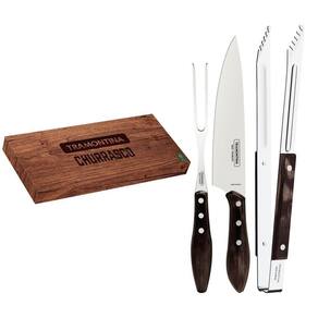 Lâminas de aço inox. Lâmina da faca com maior durabilidade do fio devido ao tratamento térmico. Lâminas do garfo e pegador que contam com maior espessura e uma estampagem do aço que garante maior resistência, evitando deformações. Cabos de madeira tratada Polywood resistentes à impactos e altas temperaturas, garantindo maior resistência e durabilidade. Rebites de aço inox.Caixa de papelão.Podem ir à máquina de lavar louças facilitando seu dia a dia.