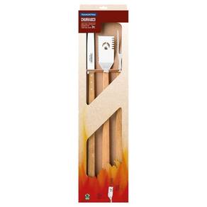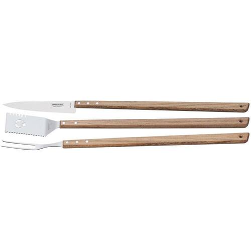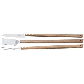 Lâminas de aço inox. A lâmina da faca têm maior durabilidade do fio devido ao tratamento térmico. As lâminas do garfo trinchante e espátula multiuso contam com maior espessura e uma estampagem do aço que garante maior resistência, evitando deformações. Os cabos são de madeira natural. Rebites de alumínio.
