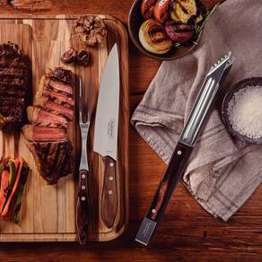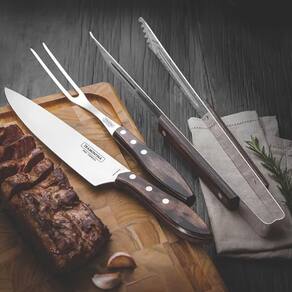 Conteúdo: Faca para Carne 8" Polywood; Garfo Trinchante Polywood; Pegador de Carne Polywood.