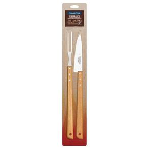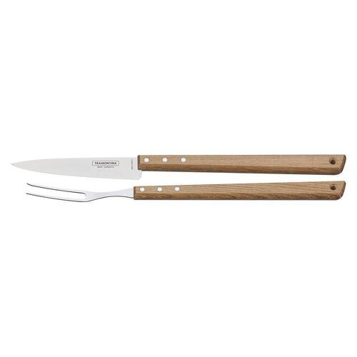 Lâminas de aço inox. A lâmina da faca têm maior durabilidade do fio devido ao tratamento térmico. As lâminas do garfo trinchante e pegador para carne contam com maior espessura e uma estampagem do aço que garante maior resistência, evitando deformações. Os cabos são de madeira natural. Rebites de alumínio.