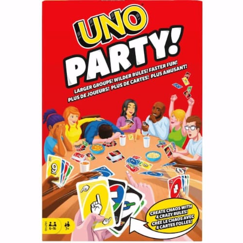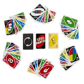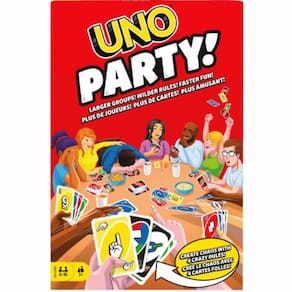 Hora de reunir todo mundo para jogar o UNO tm Party Card Game, com a jogabilidade clássica que os jogadores do UNO tm Card Game conhecem e adoram, além de cartas extras e regras especiais projetadas especificamente para grupos grandes para manter a festa em andamento As regras desta versão farão com que os jogadores passem as cartas até que alguém não possa mais jogar, apontando para outros jogadores para comprar cartas e unindo dois jogadores que devem comprar ao mesmo tempo. Há até uma nova regra de Jogo Rápido. Projetado para 6 a 16 jogadores com 7 anos de idade ou mais, o UNO tm Party é um jogo divertido para reunir famílias e amigos em festas e noites de jogos