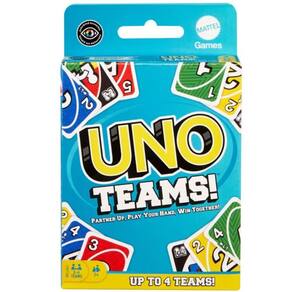 UNO Teams é uma nova maneira de jogar o jogo clássico! Os jogadores ainda combinam cor, número e símbolo, mas em vez de cada um por si, eles se unem em pares e jogam juntos para vencer. Cartas e regras especiais ajudam os companheiros de equipe a trabalharem juntos, mas ambos os jogadores devem se livrar de todas as cartas em suas mãos para vencer. E lembre-se, quando você (ou seu parceiro) estiver com a última carta, não se esqueça de gritar "UNO!".