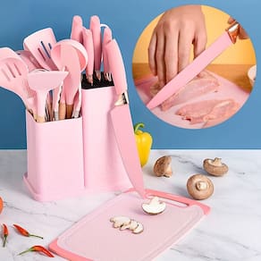 Especificações Material: Silicone, Plástico, Aço Inoxidável, Madeira Tamanho: Porta Utensílios: 23,5 cm X 21 cm Tábua de Corte: 32,7 cm x 20 cm Faca de Chef: 33 cm Faca para Pão: 33 cm Faca de Corte Geral: 33 cm Faca para Legumes: 23 cm Faca para Frutas: 19,5 cm Tesoura: 20 cm Rosa