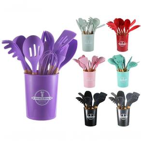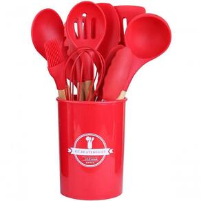 ESPECIFICAÇÕES: Material: Silicone e Madeira; Modelos: 11 peças + Porta utensílios Características: Ecologicamente Sustentável. Resistente ao calor até 230c O PACOTE INCLUI: 1 x suporte- 18cm 1 x batedor de ovos -27cm 1 x pincel- 27cm 1 x concha- 32cm 1 x espátula- 32cm 1 x espátula vazada- 32cm 1 x espátula redonda- 32cm 1 x espátula pão duro- 32cm 1 x colher-32cm 1 x colher vazada- 32cm 1 x pegador de macarrão-31cm 1 x pegador- 27cm