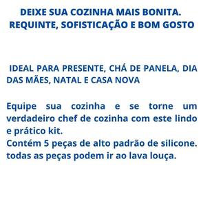Equipe sua cozinha e se torne um verdadeiro chef de cozinha com este lindo e prático Kit. Contém 5 utensílios que vão deixar sua vida mais prática e sua cozinha mais linda. O KIT CONTÉM 5 PEÇAS - Batedor de ovos - Espátula - Pincel - Espátula grande pão duro - Espátula pequena pão duro BENEFÍCIOS CONJUNTO DE SILICONE Protege e preserva revestimentos antiaderentes por muito mais tempo; Silicone de alta qualidade: suporta até 210C; Fácil de limpar e pode ir à lava-louças; É leve e oferece um manuseio firme e confortável; Não-tóxico livre de BPA e Inodoro; Design inovador e inteligente.