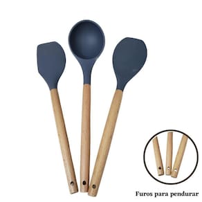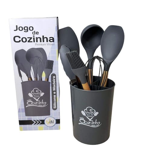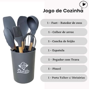 Com o Jogo De Cozinha 7 peças balde incluso você vai encontrar um jeito fácil, inovador e inteligente de preparar diversos pratos da culinária brasileira sem correr o risco de riscar suas panelas e frigideiras. O Jogo De Utensílios De Cozinha da 123útil é super resistente a altas temperaturas, com cabo de madeira proporcionando um visual elegante e equilibrado. Um kit perfeito para usar em todas as panelas de sua casa. Ficha Técnica Marca: 123Útil Produto: Kit De Cozinha Material: Madeira e silicone Cor: Cinza Conteúdo Da Embalagem 01 Pegador 26,5cm01 Batedor de claras 24cm01 Colher 31,5cm01 Concha 31cm01 Espátula 31cm01 Pincel 27cm01 Balde 16cm