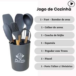 Com o Jogo De Cozinha 7 peças balde incluso você vai encontrar um jeito fácil, inovador e inteligente de preparar diversos pratos da culinária brasileira sem correr o risco de riscar suas panelas e frigideiras. O Jogo De Utensílios De Cozinha da 123útil é super resistente a altas temperaturas, com cabo de madeira proporcionando um visual elegante e equilibrado. Um kit perfeito para usar em todas as panelas de sua casa. Ficha Técnica Marca: 123Útil Produto: Kit De Cozinha Material: Madeira e silicone Cor: Cinza Conteúdo Da Embalagem 01 Pegador 26,5cm01 Batedor de claras 24cm01 Colher 31,5cm01 Concha 31cm01 Espátula 31cm01 Pincel 27cm01 Balde 16cm
