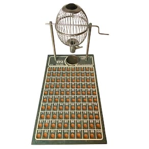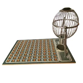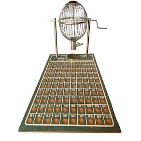 Jogo vispora completo com globo em metal, tabuleiro em madeira MDF com cavidades numeradas para as bolinhas sorteadas e 100 bolinhas de plástico numeradas.