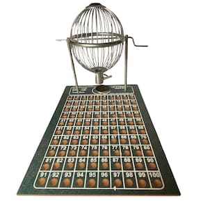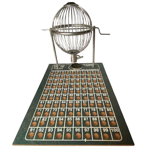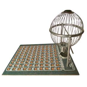 Jogo vispora completo com globo em metal, tabuleiro em madeira MDF com cavidades numeradas para as bolinhas sorteadas e 100 bolinhas de plástico numeradas.