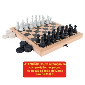 Confeccionado em M.D.F. Estojo/tabuleiro com fecho metálico serigrafado com quadrantes claros e escuros, com 32 peças de plástico para o xadrez (Rei 5 cm de altura) e 24 peças de M.D.F. para as damas, totalizando 56 peças.