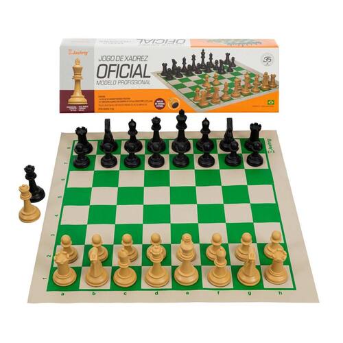 O Jogo de Xadrez Oficial com Tabuleiro em Couro Sintético é a escolha perfeita para jogadores profissionais e entusiastas. TABULEIRO:O tabuleiro é de couto sintético (courvim) na cor Bege Claro e Verde.Possui medidas oficiais de 47x47cm, com casas de 5,2cm e marcação alfanumérica, facilitando o acompanhamento das partidas. PEÇAS DE XADREZ:As peças seguem o modelo Staunton Profissional, injetadas em poliestireno de alto impacto, com base chumbada para maior estabilidade e acabamento em feltro.Com 34 peças, incluindo um par extra de rainhas, este conjunto oferece alta performance em cada partida.O rei tem uma altura de 10 cm, e as peças são nas cores preto e bege, proporcionando ótimo contraste com o tabuleiro.