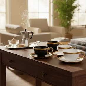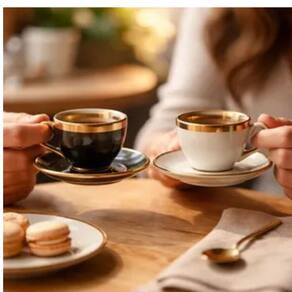 A linha Dubai da Wolff é composta por peças contemporâneas marcadas por beleza e modernidade. O jogo de xícaras de cafe é uma combinação glamurosa de porcelana branca com borda dourada em uma circunferência irregular que proporciona muitas maneiras de fascinar os convidados na arte de receber.