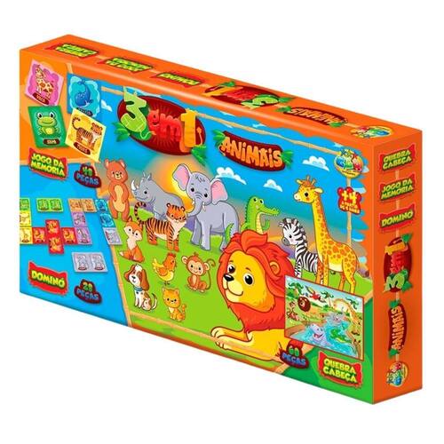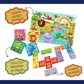 Kit de Jogos 3 em 1 - Quebra-Cabeça, Memória e Dominó - Animais