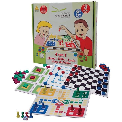 4 em 1 - Dama, Trilha, Ludo e Jogo da Velha Damas, trilhas, ludo e jogo da velha são jogos interessantes que desenvolvem a perspicácia e o pensamento lógico, assim como treina a capacidade de criar estratégias. Conteúdo: 1 jogo de dama com tabuleiro 23 x 23 cm + 24 peças em EVA, 1 jogo de trilha com tabuleiro 23 x 23 cm + 10 peças em EVA, 1 jogo de ludo com tabuleiro 23 x 23 cm + 16 peças em plástico e 1 jogo da velha com tabuleiro 23 x 23 cm + 10 peças em EVA. Faixa etária: a partir de 6 anos.