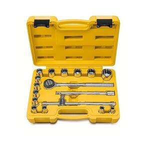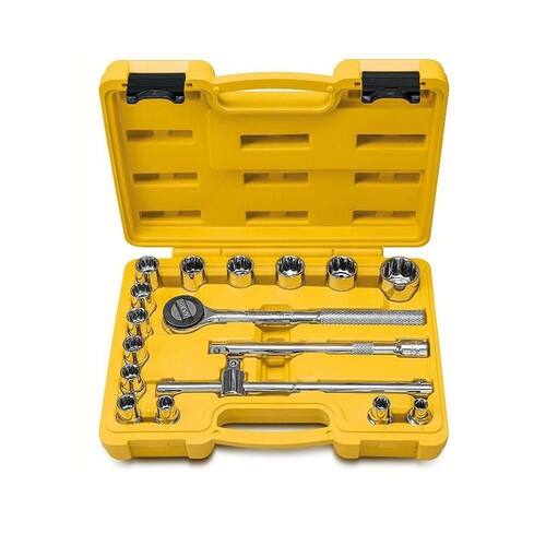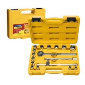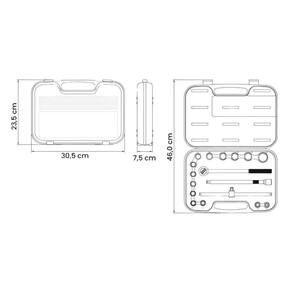 - 14 Soquetes estriados 1/2: 8, 10, 11, 12, 13, 14, 15, 16, 17, 19, 21, 22, 24, 30 mm1 Catraca reversível 1/21 Cabo T 101 Extensão 81 Maleta plástica.